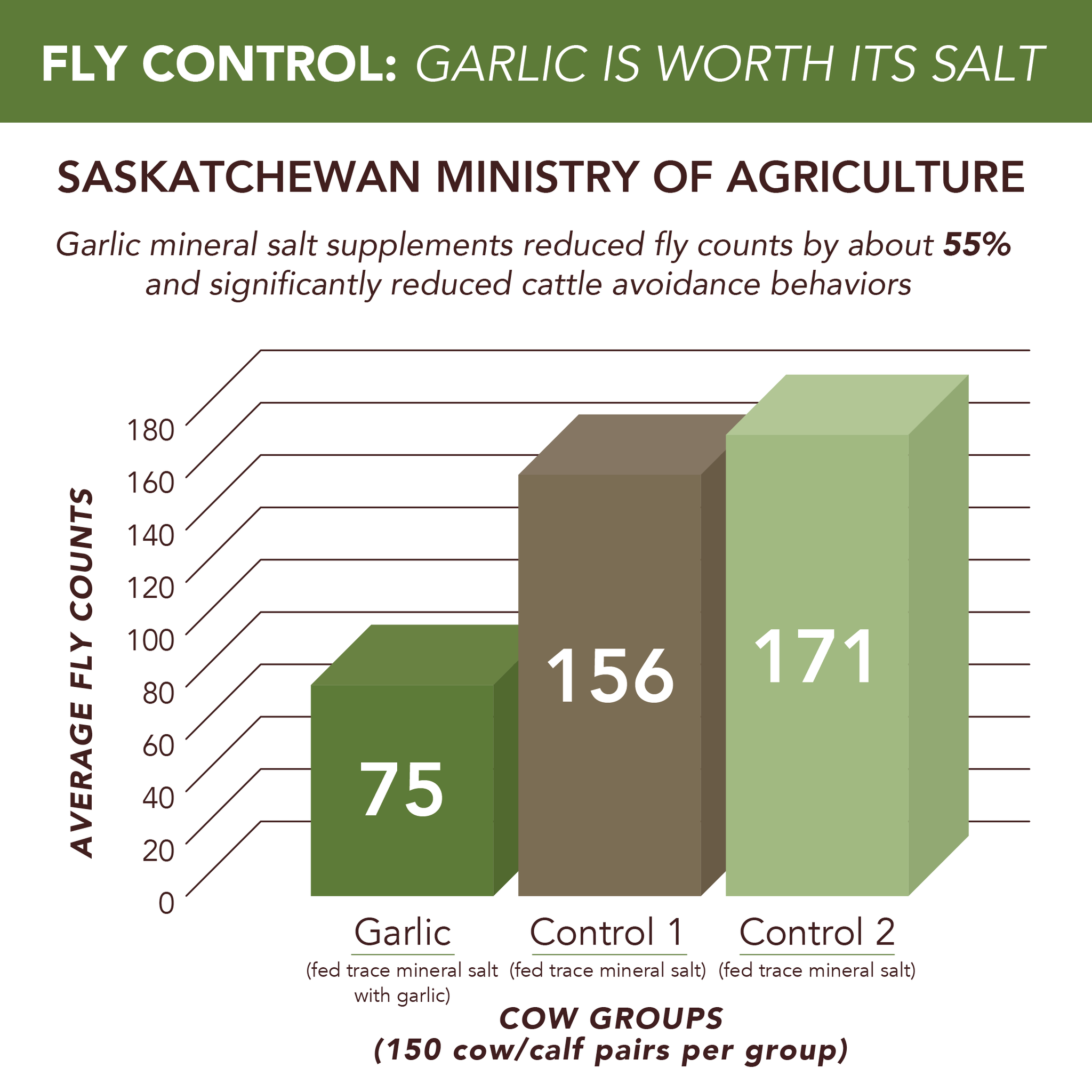 The Saskatchewan Department of Agriculture conducted an extensive field test on the effectiveness of garlic mineral salt for fly control. 3 herds, consisting of 150 cow/calf pairs each, were each given mineral salt, with 1 herd being fed garlic mineral salt.