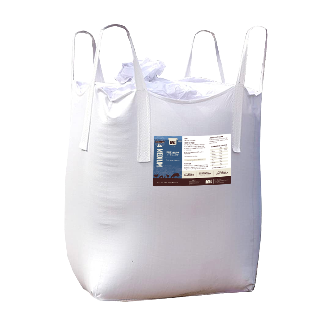 4 Medium is our premium mineral salt in a larger granule size than Redmond 10 Fine. It provides the same full spectrum of trace minerals that improve animal nutrient intake. Though especially popular in sheep operations, Redmond 4 Medium is suitable for cattle, goats, and other livestock.
