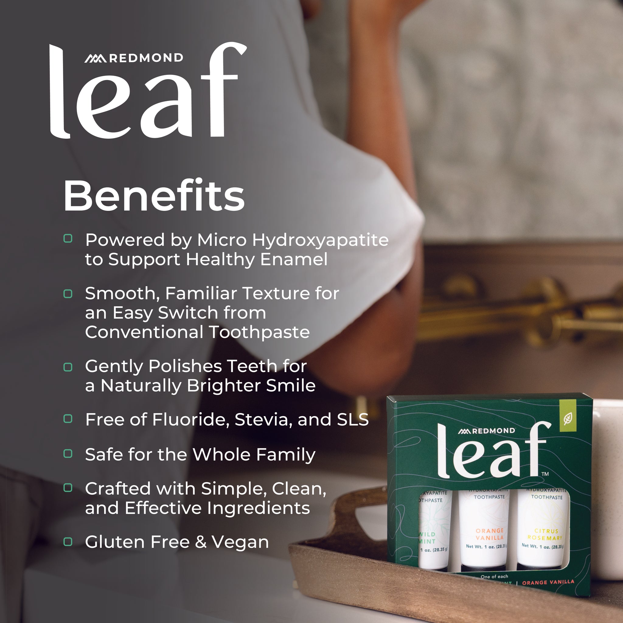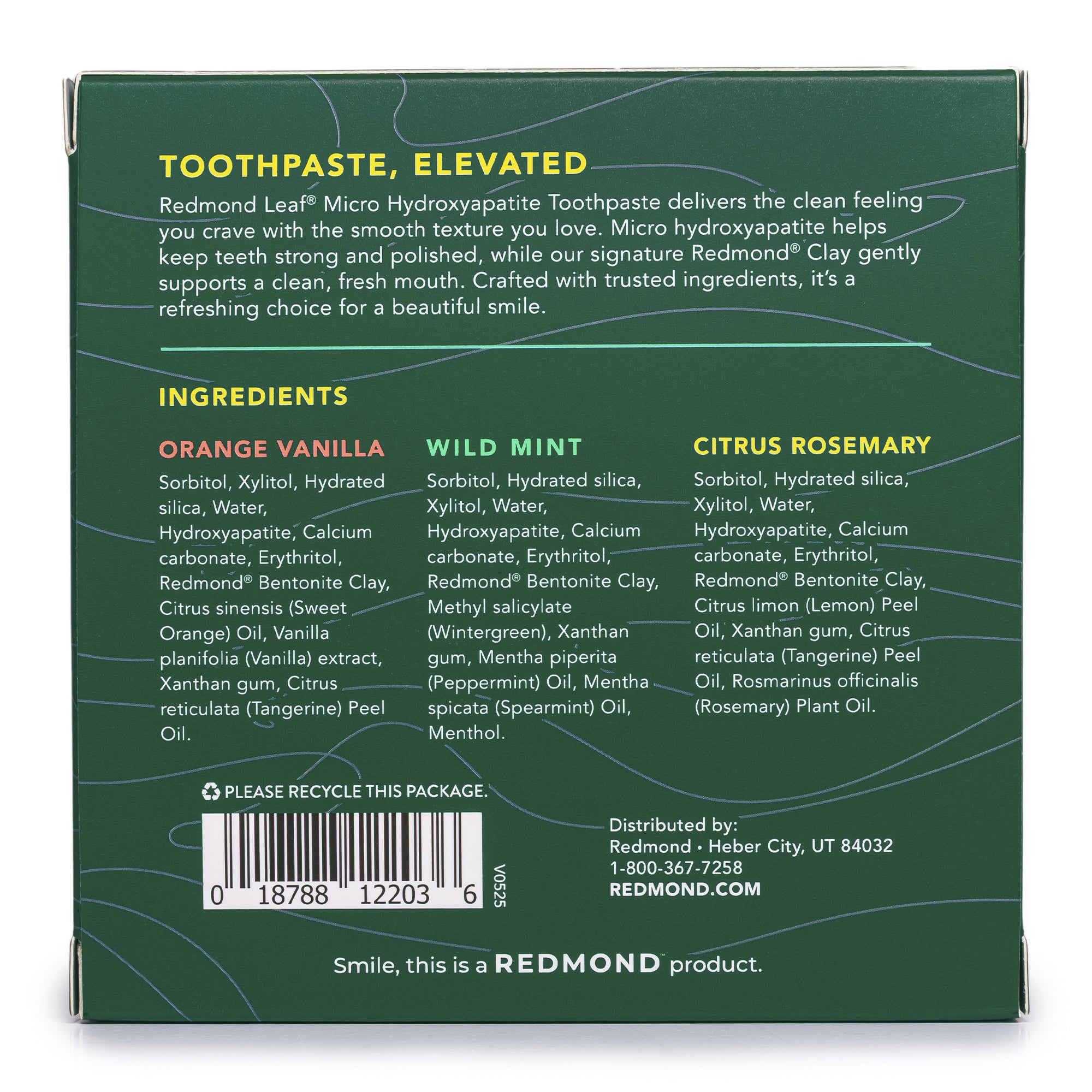 Redmond Leaf Micro Hydroxyapatite Toothpaste is a fluoride-free toothpaste with a smooth, creamy texture and clean, trusted ingredients. As a hydroxyapatite toothpaste (or HAp toothpaste), it supports enamel strength and helps maintain a naturally bright smile. Made with micro hydroxyapatite, a mineral often included in remineralizing toothpaste formulas, and Redmond Clay for gentle polishing, it’s a refreshing choice for the whole family. Available in Wild Mint, Citrus Rosemary, and Orange Vanilla.